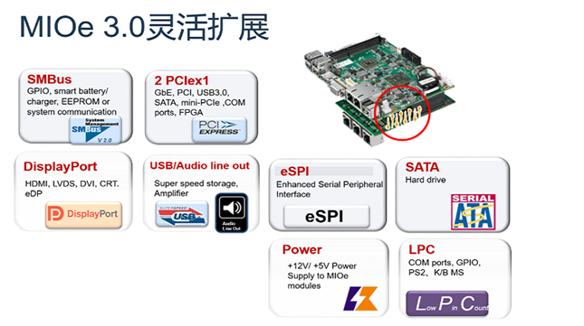 MIOe擴(kuò)展接口是研華自主推行的擴(kuò)展接口標(biāo)準(zhǔn),高度集成的設(shè)計(jì)能夠節(jié)約20%的系統(tǒng)空間。MIOe 3.0包含了如下常用的功能信號,客戶可在擴(kuò)展底板上直接使用,從而可將精力投入產(chǎn)品核心功能的開發(fā),大大加速了客戶創(chuàng)新產(chǎn)品上市。