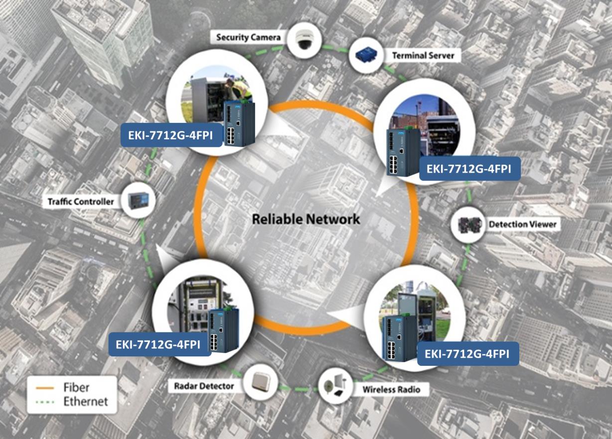 EKI-7712G-4FPI支持具有240 W PSE功能的完整PoE +,非常適合為交通攝像頭和無(wú)線電供電和連接。