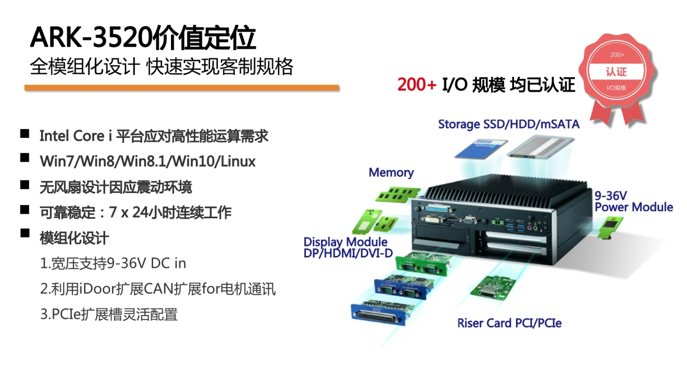 ![]() 研華嵌入式無風(fēng)扇工控機(jī),采用模組化設(shè)計(jì),將功能模塊做選配設(shè)計(jì),因?qū)Ω骺蛻粜枨笞龌蚝喕蚍钡囊?guī)格配置,ARK-3520此單一機(jī)種可以達(dá)到200多種規(guī)格,且全部認(rèn)證,以便快速打造客戶方案。針對AGV內(nèi)部供電不穩(wěn)定,ARK-3520還增設(shè)寬壓模塊,規(guī)格9-36V,基本可以覆蓋絕大多數(shù)工業(yè)場景應(yīng)用;透過IDoor擴(kuò)展CAN BUS,以連接電機(jī);還有靈活的PCI(e)擴(kuò)展槽,以連接運(yùn)動控制卡,如有需要請致電聯(lián)系我們 以上案例來自研華官網(wǎng)