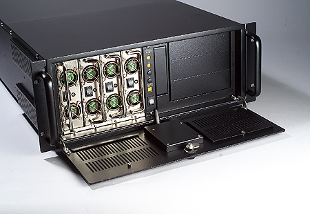 Shockproof disk drive bay design can hold up to three front-accessible 5.25" and one 3.5" disk drives, and one internal 3.5" HDD